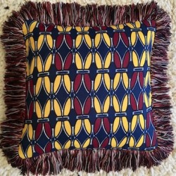 Des coussins en Wax bordés de passementerie pour des canapés joyeux et chatoyants.
