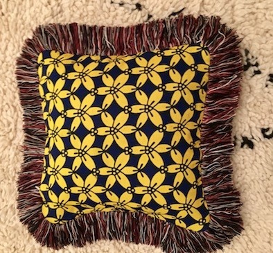 Des coussins en Wax bordés de passementerie pour des canapés joyeux et chatoyants.